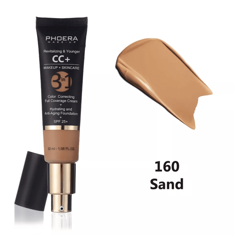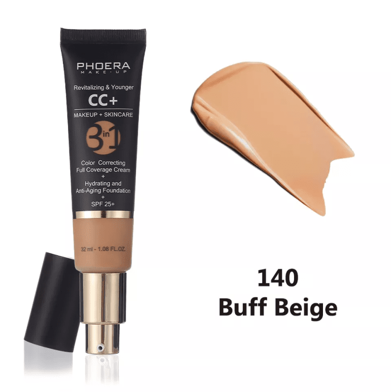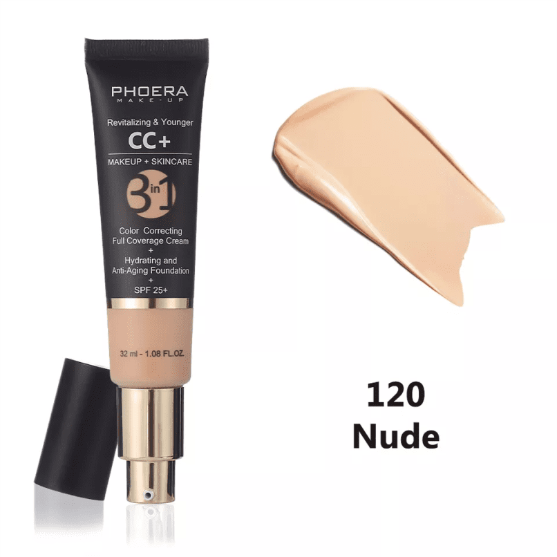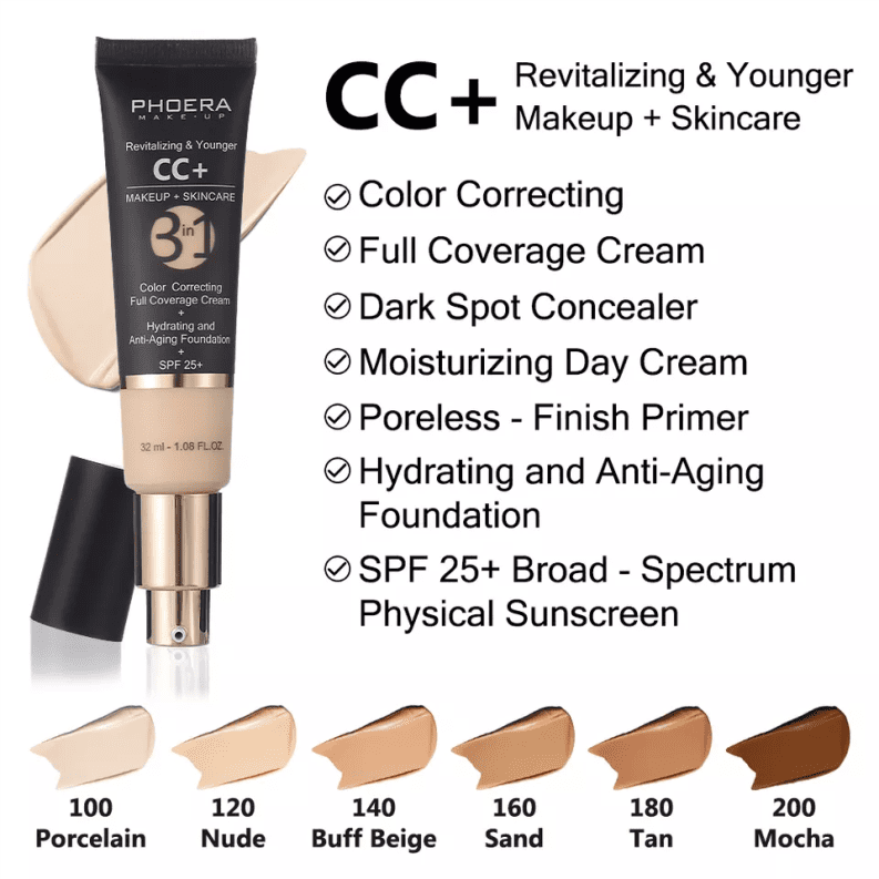 PHOERA CC+ Cream is a full-coverage foundation, hydrating anti-aging serum, broad-spectrum physical sunscreen, brightening color corrector, pore less-finish primer, dark spot concealer and moisturizing day cream.