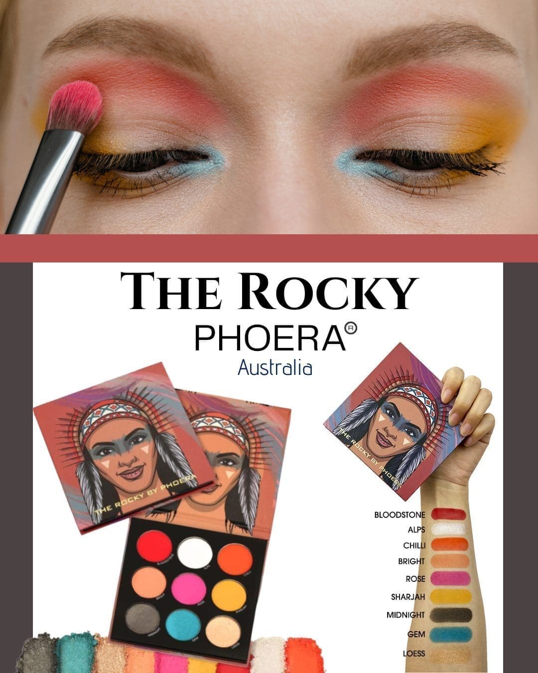 The ROCKY is a bold and fiery collection of 9 stunning shades, including bold coral, show-stopping red, and glittery neutrals. High-pigment hues and a healthy dose of shimmer make this eyeshadow palette the perfect complement to every makeup look, and for any goddess that knows how to march to the beat of her own drum.